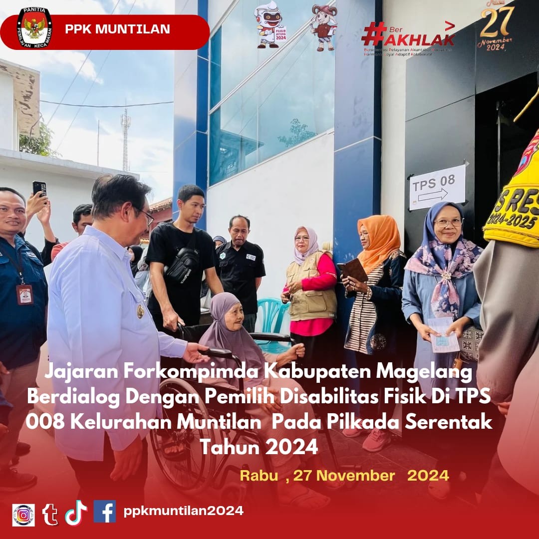 MUNTILAN_ Sebanyak 400 pemilih disabilitas terdaftar dalam Daftar Pemilih Tetap (DPT) untuk Pemilihan Gubernur dan Wakil Gubernur Jawa Tengah serta Bupati dan Wakil Bupati Magelang Tahun 2024.Pemilih disabilitas ini berada di 14 Kelurahan / Desa,tersebar di 114 TPS.