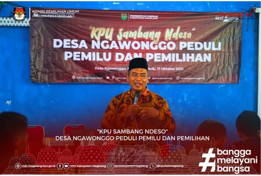 “Secara kuantitas, KPU Kabupaten Magelang mencatat beberapa TPS di Desa Ngawonggo pada saat pemungutan suara Pilkada Serentak 2024 tingkat kehadiran pemilih di TPS ada yang berada dibawah angka 70 %”, terang Ahmad Rofik Ketua KPU Kabupaten Magelang saat memberikan materi tentang pentingnya partisipasi masyarakat dalam pemilu dan pemilihan dalam kegatan KPU Sambang Ndeso Desa Peduli Pemilu dan Pemilihan, Jumat (17/10/2025), di Gedung Kesenian Desa Ngawonggo Kecamatan Kaliangkrik.