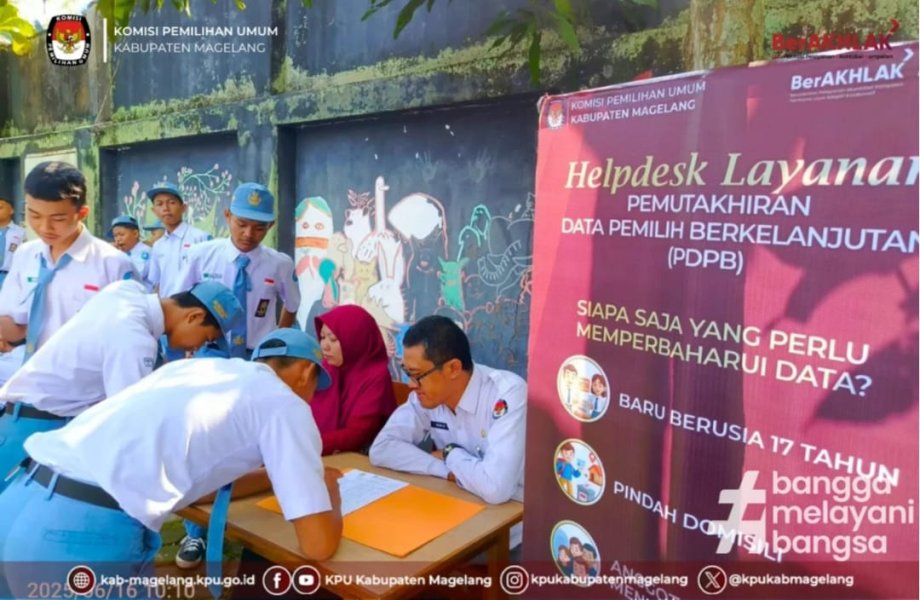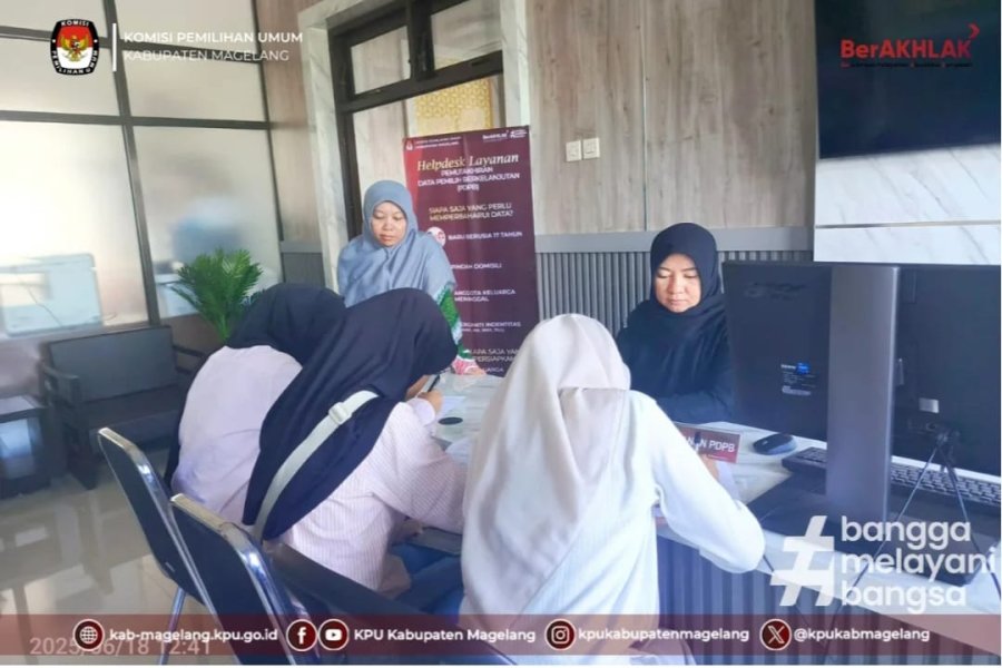 KOTA MUNGKID- KPU Kabupaten Magelang terus berupaya memperbarui data pemilih secara berkelanjutan melalui layanan Helpdesk Pemutakhiran Data Pemilih Berkelanjutan (PDPB) Tahun 2025. Sejak dibukanya layanan ini, sejumlah pemilih pemula yang baru memasuki usia 17 tahun ada yang proaktif memanfaatkan layanan dengan datang langsung ke kantor KPU Kabupaten Magelang guna memastikan dirinya tercatat sebagai pemilih untuk Pemilu Serentak Tahun 2029, Rabu (18/6/2025). Menurut Siti Nurhayati Ketua Divisi Perencanaan Data dan Informasi, partisipasi aktif dari pemilih pemula, terutama yang baru genap berusia 17 tahun, merupakan cerminan dari meningkatnya kesadaran demokrasi di kalangan generasi muda “Kami sangat mengapresiasi inisiatif mereka yang datang secara mandiri untuk melaporkan data dan memastikan hak pilihnya tercatat dengan benar”, Ungkapnya Melalui layanan Helpdesk PDPB, masyarakat dapat melaporkan perubahan atau penambahan data pemilih, termasuk bagi mereka yang baru memenuhi syarat sebagai pemilih, seperti telah berusia 17 tahun, pindah domisili, berganti identitas ataupun anggota keluarga yang meninggal. Untuk melaporkan diri sebagai pemilih baru, masyarakat cukup membawa fotokopi KTP-elektronik dan/atau Kartu Keluarga ke kantor KPU Kabupaten Magelang atau mengakses layanan daring melalui tautan (link) PDPB KPU Kabupaten Magelang https://bit.ly/PDPB_KPUKABMAGELANG KPU Kabupaten Magelang juga terus melakukan sosialisasi secara langsung maupun melalui akun media sosial untuk menjangkau kelompok pemilih pemula agar proses pemutakhiran data berjalan akurat dan partisipatif. “Kami mengajak seluruh masyarakat yang sudah memenuhi syarat, terutama yang baru genap berusia 17 tahun, untuk segera melapor.Pastikan Anda terdaftar agar tidak kehilangan hak suara pada pemilu lima tahun yang akan datang”, Pesannya. Pemutakhiran Data Pemilih Berkelanjutan merupakan bagian dari program nasional KPU dalam memelihara dan memperbaharui data pemilih secara berkala agar data tetap valid, akurat, mutakhir dan komprehensif (***/RED).