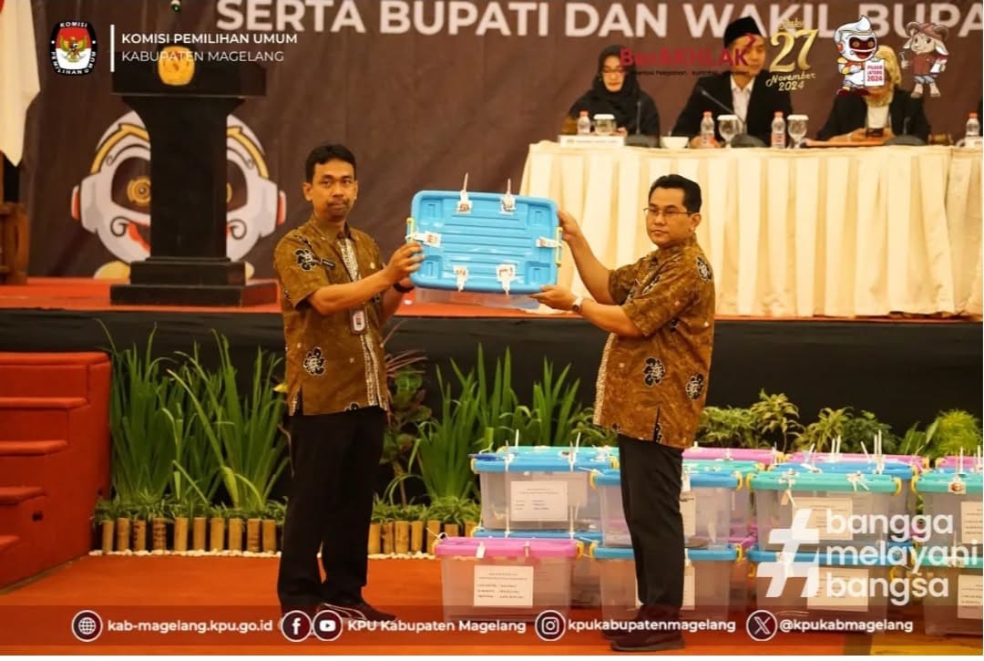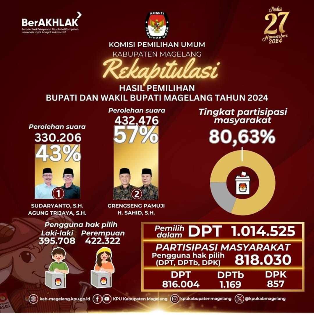 KOTA MUNGKID_Melengkapi prestasi sebelumnya, KPU Kabupaten Magelang berhasil meraih peringkat kedua terbaik se- Jawa Tengah untuk kategori penghargaan Sosialisasi Pemilu dan Partisipasi Pemilih, pada malam penghargaan Anugerah Karya Adinata Tahun 2024 yang diselenggarakan KPU Provinsi Jawa Tengah, Ahad (15/12/2024) di Semarang. Peringkat pertama diraih KPU Temanggung dan peringkat ketiga KPU Kota Salatiga. Acara ini dihadiri ketua dan anggota KPU serta sekretaris dan pejabat struktural di lingkungan KPU kabupaten/kota se-Jawa Tengah Penghargaan ini merupakan wujud apresiasi dan penilaian KPU Provinsi Jawa Tengah atas kinerja 35 satuan kerja penyelengara pemilu dan pemilihan tingkat kabupaten/kota di Jawa Tengah selama penyelenggaraan Pemilu Serentak Tahun 2024. Malam penghargaan ini merupakan rangkaian kegiatan Evaluasi Tahapan Pemilu Serentak Tahun 2024 di Jawa Tengah oleh KPU Provinsi Jawa Tengah, yang dihadiri anggota KPU RI, Yulianto Sudrajat. Ketua KPU Kabupaten Magelang Ahmad Rofik mengungkapkan raihan prestasi ini menjadi cermin untuk mengevaluasi diri bagi KPU Kabupaten Magelang untuk bekerja lebih baik lagi, tidak hanya dalam tahapan sosialisasi dan peningkatan partisipasi pemilih dalam pesta demokrasi, namun juga untuk kategori terbaik lainya seperti manajemen logistik, pertanggungjawaban keuangan, manajemen pemutakhiran data pemilih juga tahapan rekapitulasi penghitungan perolehan suara serta manajemen penanganan sengketa PHPU. Sejumlah prestasi yang telah diraih KPU Kabupaten Magelang juga diharapkan menjadi titik awal untuk menunjukkan kinerja lebih baik lagi dalam mengemban tugas pokok dan fungsi KPU sebagai penyelenggara pemilu dan pemilihan, tidak hanya saat tahapan pemilu dan pemilihan berlangsung namun juga setelah tahapan pesta demokrasi berlalu. Sementara itu Yulianto Sudrajat dalm sambutannya menyampaikan bahwa kajian evaluasi penyelenggaraan pemilu menjadi awal yang baik untuk menjawab tantangan kedepan KPU sebagai panglima penyelenggara pemilu. KPU harus percaya diri dengan melaksanakan kajian komprehensif atas kerja pembaruan atau updating data pemilu, sosialisasi dan pendidikan pemilih, pengelolaan aplikasi berbasis teknologi informasi seperti Sipol, Silon, Sidalih sebagai tugas penting KPU yang harus diketahui publik, untuk menjawab stigma KPU tidak bekerja dan tidak berkontribusi apapun diluar tahapan penyelenggaran pemilu maupun pemilihan. KPU perlu kreatifitas dalam menjalankan tugas agar masyarakat merasakan kehadiran KPU meskipun tidak sedang dalam tahapan pemilu dan pemilihan. “Keterbatasan anggaran jangan dijadikan alasan untuk tidak kreatif, justru inilah tantangan sebenarnya”,Tandas Yulianto. Pada prinsipnya KPU Kabupaten Magelang akan terus melaksanakan tugas pokok dan fungsinya dalam rangka pendidikan pemilih dan berkontribusi dalam pembangunan demokrasi. Melalui keterbukaan informasi dan aktivitas KPU kab Magelang yang pro aktiv menyapa pemilih dan masyarakat akan dapat membangun partisipasi dan kolaborasi dari masyarakat dan stakeholders. Menurunnya kendala keterbatasan pendanaan bisa dipecahkan bersama selama ada niatan. (***/RED)