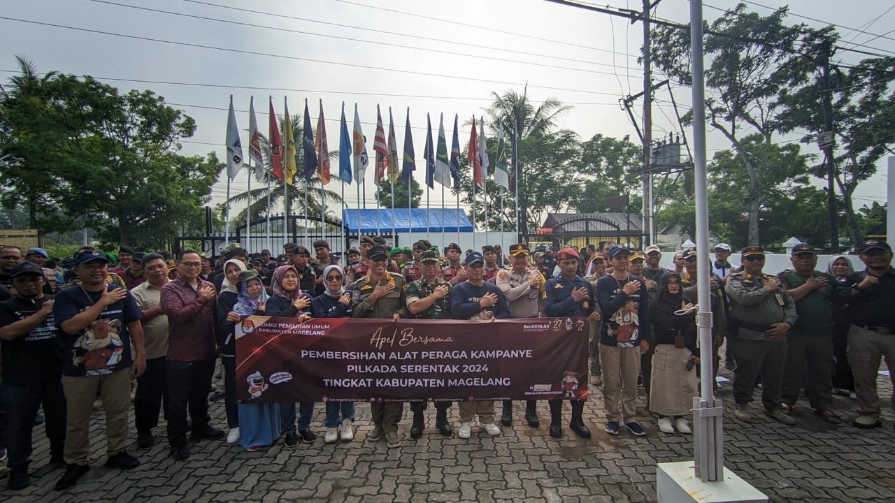 KOTA MUNGKID_ Memasuki masa tenang Pilkada 2024 tanggal 24-26 November 2024, KPU Kabupaten Magelang bersama tim gabungan yang terdiri dari jajaran Bawaslu, Kepolisian, TNI, dan Pemerintah Kabupaten Magelang, menurunkan ribuan Alat Peraga Kampanye (APK) dan bahan kampanye pada Minggu (25/11/2024). Sebelum melakukan penertiban, seluruh tim melakukan apel di Halaman Kantor KPU Magelang " Stelah Apel kesiapan ini, kita akan bersama-sama melakukan penertiban dan menurunkan APK dan bahan kampanye. Hal ini merupakan amanat dari PKPU nomor 13 tahun 2024 tentang kampanye. Dimana mulai hari minggu ini hingga selasa besok, adalah masa tenang. Dan di masa tenang itu, tidak boleh ada kampanye dalam bentuk apa pun. Karena itu, APK dan bahan kampanye harus turun,” kata Ketua KPU Kabupaten Magelang, Ahmad Rofik dalam sambutannya. Disampaikan jika APK dan bahan kampanye sesuai PKPU nomor 13 Tahun 2024 itu, kata Rofik, ada dua jenis. Yakni yang difasilitasi KPU dan APK tambahan yang dibuat dan dipasang oleh peserta Pemilu/Pilkada. Dalam hal ini adalah pasangan calon (paslon), tim kampanye, partai politik dan atau gabungan partai politik. “Sesuai bunyi PKPU, untuk jumlah APK tambahan itu bisa lebih dari 200 persen dan APK itu harus sudah bersih tiga hari sebelum pemungutan suara. Dan hari ini kita akan menurunkan seluruhnya, baik yang difasilitasi KPU maupun yang dipasang oleh paslon, tim kampanye, partai politik dan atau gabungan partai politik peserta Pemilu atau Pilkada. Hal ini adalah bagian dari iktiar kita, untuk menciptakan Pilkada di Kabupaten Magelang, dapat berjalan dengan damai, aman, dan kondusif tanpa ekses,” harapnya. Dalam penertiban ini, KPU membuat enam rute dan enam tim. Rute pertama Mendut, Palbapang dan Artos. Rute kedua, dimulai dari Palbapang, Muntilan hingga Tugu Ireng Salam. Rute ketiga, dari Blondo, Mungkid, Borobudur hingga Bunderan Salaman. Rute ke empat, dari Artos, Pakelan, Tempuran, Salaman hingga Margoyoso. Rute kelima, dari Artos, Canguk, Payaman hingga Secang dan rute keenam dari Canguk, Tegalrejo, Pakis hingga Ngablak. “Untuk masing-masing rute itu, dipimpin komisioner dan sekretaris. Setiap tim, beranggotakan dari TNI dan Polri, Satpol PP, Dinas Lingkungan Hidup, Dinas Perhubungan dan DPU. Selain itu, kami juga dibekali empat alat crane untuk menurunkan APK yang dipasang di Bilboard dan papan-papan reklame berbayar lainnya. Kita laksanakan pembersihan APK ini dengan sebaik-baiknya dan penuh tanggungjawab,” pesannya. Selain bersama tim gabungan tersebut, KPU juga menerjunkan seluruh badan adhoc mulai dari PPK, PPS, hingga KPPS untuk bersama-sama dengan jajaran Bawaslu di kecamatan, desa dan TPS. “Untuk penertiban dan penurunan APK hari ini, kami juga melibatkan PPK, PPS dan KPPS. Mereka bersama-sama dengan Panwascam, PKD dan PTPS serta pemerintah di kecamatan serta desa,” jelasnya. Pembersihan APK hari pertama belum semuanya dapat diturunkan karena kendala terbatasnya alat crane dan cuaca yang tidak mendukung dengan turunnya hujan lebat di beberapa titik lokasi. (***/RED)