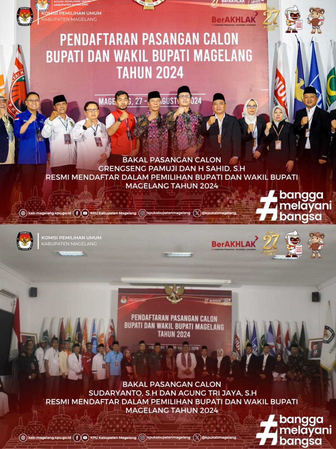 KOTAMUNGKID_Berdasarkan hasil pemeriksaan kesehatan di RSUD Dr Moewardi, Kota Surakarta, dua bakal pasangan calon (paslon) Bupati dan Wakil Bupati Magelang dinyatakan lolos tes pemeriksaan kesehatan. Kedua bakal paslon tersebut adalah Sudaryanto dan Agung Trijaya (Satria) serta Grengseng Pamudji dan Sahid (Progres). "Hasil tes kesehatan kedua paslon ini, kami terima pada tanggal 4 September lalu dari RSUD Dr Moewardi. Kedua paslon dinyatakan memenuhi syarat secara pemeriksaan kesehatan serta mampu secara jasmani dan rohani untuk melanjutkan tahapan Pilkada 2024,” kata Ketua Divisi Teknis KPU Magelang, Nurul Ekawati. Dijelaskan, dari semua poin pemeriksaan, termasuk pemeriksaan BNN terkait penyalahgunaan narkotika, kedua paslon dinyatakan lolos memenuhi syarat dan tidak ada gangguan kesehatan apapun. "Setelah ini, tahapan selanjutnya adalah pemeriksaan dan penelitian persyaratan calon. Berita acara hasil pemeriksaan administrasi terkait dengan syarat pendaftaran para calon, sudah kami serahkan ke masing-masing LO paslon maupun masing-masing admin Silonkada para calon pada Kamis 5 Septemer lalu," jelasnya. Selain itu hasil pemeriksaan administrasi, ada beberapa yang perlu diperbaiki. Dicontohkan, perbaikan penggunaan foto kedua pasangan calon. Yang harusnya memakai latarbelakang warna putih, namun kedua paslon masih memakai yang berwarna. "Juga masih ada beberapa dokumen yang salah redaksional dan perlu diperbaiki. Masa perbaikan ini dari Jumat tanggal 6 sampai 8 September besok,” ungkapnya. Untuk surat pengunduran diri jika pasangan calon merupakan anggota dewan, dijelaskan hal ini juga yang kemarin masuk dalam list daftar perbaikan dokumen yang diserahkan. Masing-masing pasangan calon, surat pengunduran dirinya masih berupa peryataan pengunduran diri. "Kami meminta paslon ini menyampaikan surat pengunduran diri yang ditujukan ke Sekretaris DPRD. Meskipun nantinya proses pemberhentian ini baru selesai sebelum penetapan paslon pada 22 September mendatang tidak apa-apa. Di sini yang kita butuhkan untuk pendaftaran adalah tanda terima bahwa pihak Sekwan sudah menerima surat pengunduran diri, dan surat keterangan yang menyatakan bahwa surat pengunduran diri ini sedang berproses,” jelasnya. Seperti diketahui, Grengseng Pamuji dan Sahid merupakan anggota DPRD Kabupaten Magelang. Sedangkan Sudaryanto adalah anggota DPRD Provinsi DIY. (***/RED)