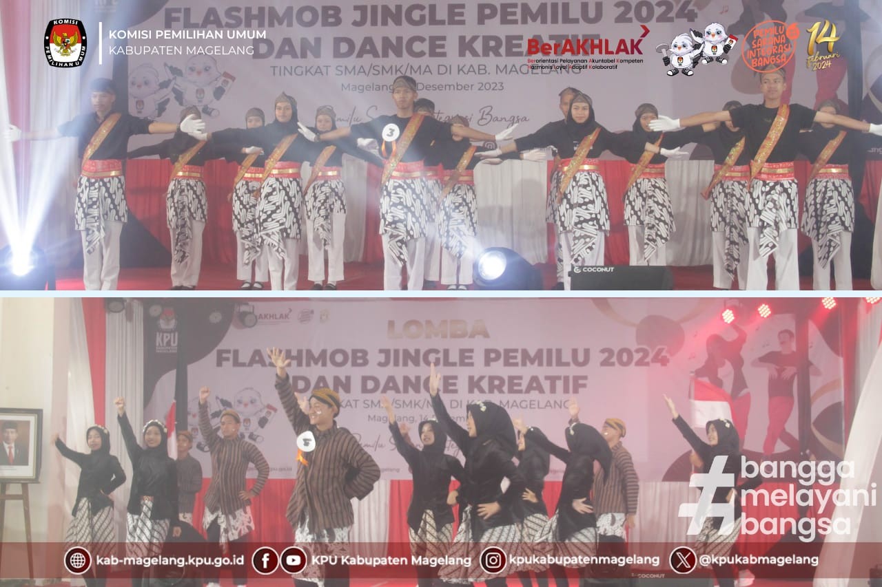 Kota Mungkid_ Tim SMK Islam Sudirman Grabag berhasil menjuarai Lomba Flashmob Jingle Pemilu 2024 Bagi SMA/SMK/MA di Kabupaten Magelang, Kamis (14/12/2023), di GOR Gemilang, Kompleks Setda Kabupaten Magelang. Kompetisi kreasi seni ini digelar KPU Kabupaten Magelang sekaligus dalam rangka sosialisasi dan pendidikan pemilih Pemilu Tahun 2024 untuk menyukseskan Pemilu 2024. Ajang lomba ini dimeriahkan pula oleh penampilan Tarian Pembuka bernuansa etnik truntung dari Sanggar Kinara-Kinari Borobudur dan penampilan grup mini band All Size Magelang. Tampil sebagai Juara dua dan tiga berturut-turut, Tim SMK Muhammadiyah 1 Muntilan dan SMK Muhammadiyah Salaman. Sedangkan Tim Favorit, diraih Tim SMK Muhammadiyah Salaman yang juga menampilkan tarian kreatifnya didepan juri dan penonton. Ketua Divisi Sosdiklih Parmas dan SDM KPU Kabupaten Magelang, Dwi Endys Mindarwoko, saat membuka kegiatan lomba, mengatakan KPU terus berupaya mengajak pemilih pemula untuk berperan akstif dalam setiap penyelenggaraan pemilu. Salah satunya dengan menjadi pemilih cerdas saat menggunakan hak pilihnya di TPS. Menurutnya, Pemilih pemula perlu menjadi insan muda yang cerdas dalam berdemokrasi, sebagai salah perwujudan peran aktifnya dalam kehidupan bangsa. (***/RED)