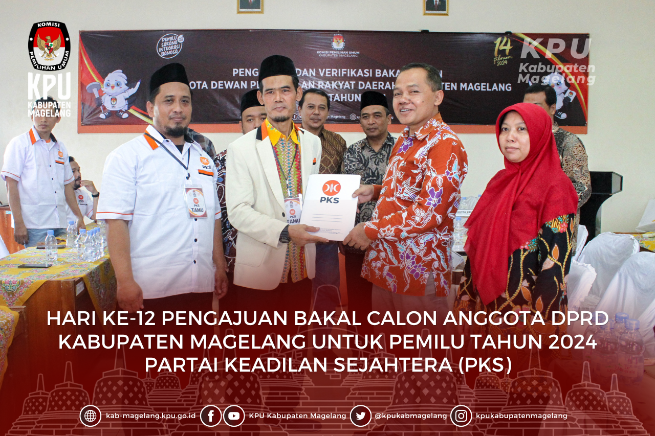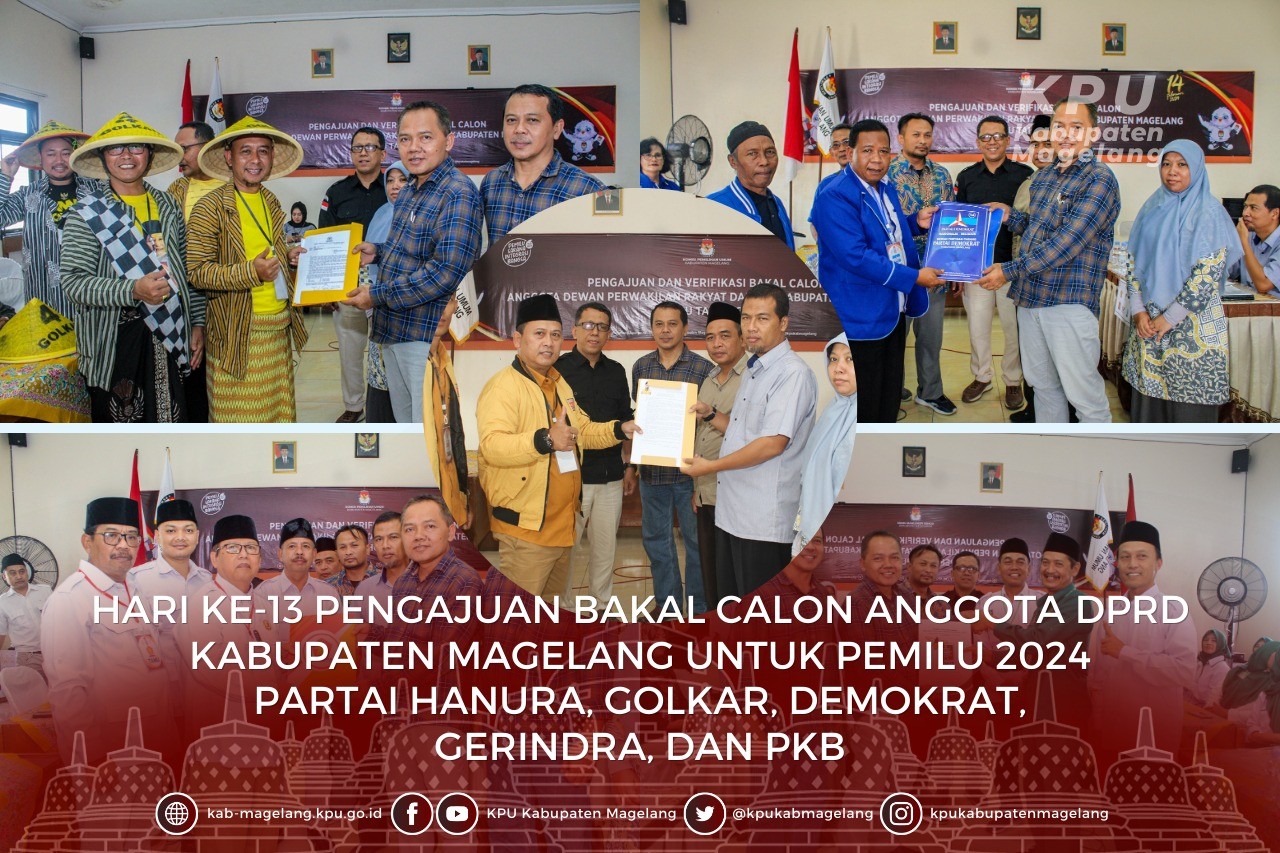 Kota Mungkid_ Hari terakhir atau hari ke-14 Jadwal Pengajuan Bacaleg, Ahad (14/5/2023), 10 partai politik mendatangi KPU Kabupaten Magelang untuk mengajukan bacalegnya untuk berkontestasi dalam pesta demokrasi Pemilu 2024 tingkat Kabupaten Magelang. Terekap hingga Senin dini hari pukul 04.17 WIB, tercatat di Aplikasi Silon ada 639 bacaleg dari 18 parpol yang segera akan diverifikasi dokumen persyaratan administrasinya oleh KPU Kabupaten Magelang. Tepat batas akhir atau hari ke 14 Tahapan pengajuan Bacaleg, 10 partai politik mendatangi KPU Kabupaten Magelang . Menjelang detik-detik akhir Ahad malam (14/5/2023) , sejumlah partai baru peserta pemilu 2024 seperti Partai Gelora Indonesia, Partai Buruh, PBB, Partai Perindo serta Partai Garuda masih harus berjibaku mengisi data bacalegnya melalui Aplikasi Silon, agar pengajuan bacaleg mereka dapat diproses lanjut oleh KPU Kabupaten Magelang dan dapat diberikan tanda terima serta Berita Acara Pengajuan Bacalegnya. Sebelumnya, Ahad siang, DPD Partai Amanat Nasional (PAN) Kabupaten Magelang resmi mengajukan bakal calon legislatornya ke Kantor KPU Kabupaten Magelang. Partai berlambang matahari putih bersinar cerah ini mendaftarkan 50 bacalegnya. Kedatangan DPD PAN ini dipimpin langsung , Son Haji, Ketua DPD PAN Kabupaten Magelang didampingi Sekretaris beserta pengurus juga beberapa bacalegnya. Son Haji mengatakan pihaknya siap mengikuti aturan yang ditetapkan KPU. “ PAN Kabupaten Magelang siap mengikuti aturan yang ada, dan mohon kerjasama KPU agar pengajuan bacaleg ini lancar”, Ungkapnya didepan Tim Penerimaan Pengajuan Bacaleg Pemilu 2024 KPU Kabupaten Magelang, Ahad (14/5/2023), di Ruang Rapat (aula) Kantor KPU setempat. Selang tiga jam kemudian, KPU Kabupaten Magelang kembali menerima kedatangan partai politik peserta Pemilu 2024 yakni , Dewan Pimpinan Cabang (DPC) Partai Persatuan Pembangunan (PPP) Kabupaten Magelang yang mengajukan bacalegnya sebanyak 42 orang, yang tersebar di enam Daerah Pemilihan di Kabupaten Magelang. Rombongan Partai berlambang kabah ini dipimpin ketua DPC yang baru, Lilik Tri Handoko. Dalam kata pembukanya, Lilik menyampaikan pihaknya sangat berterima kasih kepada KPU Kabupaten Magelang yang sudah menerima dengan baik. “Kami mohon maaf, agak terlambat dari jadwal yang telah kami ajukan, karena ada sedikit komunikasi yang crowded dengan DPP PPP”, Ungkapnya. Menyusul Pukul 15.00 WIB, Rombongan DPD Partai Solidaritas Indonesia (PSI) Kabupaten Magelang , juga datang mengajukan bacalegnya sebanyak 16 oarang, yang nantinya akan berkontestasi di enam Daerah Pemilihan Kabupaten Magelang dalam Pemilu 2024. Edi Wiratno, selaku Ketua DPD PSI Kabupaten Magelang menyampaikan permohonan maaf bila masih banyak kekurangan dalam tahapan pengajuan bacaleg ini, karena PSI masih merupakan partai baru. (***/RED)
