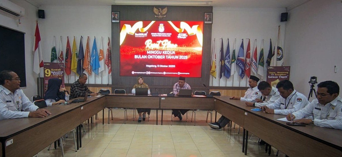 KOTA MUNGKID – KPU Kabupaten Magelang menggelar rapat pleno rutin dengan agenda utama mengevaluasi kegiatan yang dilakukan pekan sebelumnya, dan persiapan kegiatan pekan selanjutnya. dalam satu bulan. Rapat Pleno diikuti seluruh anggota KPU beserta sekretaris dan jajaran pejabat struktural Sekretariat KPU Kabupaten Magelang “Rapat pleno ini, rutin kami lakukan setiap awal pekan,” kata Ketua KPU Kabupaten Magelang, Ahmad Rofik, usai memimpin rapat pleno rutin, Senin (13/10/2025). Salah satu kegiatan yang dievaluasi diantaranya, KPU Sambang Ndeso di Desa Tirtosari Kecamatan Sawangan, persiapan pemindahan logistik dari gudang Taman Agung ke gudang pinjam pakai dari Pemkab Magelang, yang berlokasi di gedung bekas SD Sawitan Mungkid, serta hasil koordinasi dengan beberapa desa di Kecamatan Borobudur terkait program Pemutakhiran Data Pemilih Berkelanjutan (PDPB). “Selain mengevaluasi, kami juga bahas persiapan kegiatan KPU Sambang Ndeso Desa Peduli Pemilu dan Pemilihan di Desa Ngawonggo Kecamatan Kaliangkrik dan PDPB di Kecamatan Salaman, termasuk juga coklit terbatas yang akan dilaksanakan Rabu besok,” ungkapnya. (***/RED)