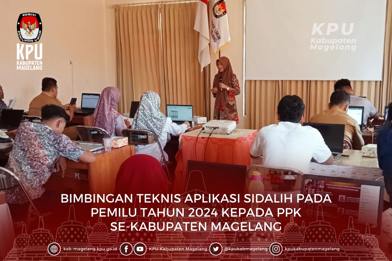 Kota Mungkid_ Menjelang tahapan penyusunan Daftar Pemilih Sementara (DPS) Pemilu 2024 oleh PPS, KPU Kabupaten Magelang, Selasa (7/3/2023) menggelar Kegiatan Bimbingan Teknis Aplikasi Sidalih Pemilu 2024 kepada Panitia Pemilihan Kecamatan (PPK) khususnya divisi Data dan Informasi . Kegiatan ini dimaksudkan sebagai persiapan akhir bagi Panitia Pemilihan Kecamatan (PPK) untuk mengunggah daftar pemilih hasil pencocokan dan penelitian data pemilih oleh Petugas Pemutakhiran Data Pemilih (pantarlih) yang telah dicanangkan secara serentak di seluruh Indonesia oleh KPU RI, 12 Februari 2023 lalu. Penyusunan Daftar Pemilih Sementara (DPS) yang merupakan tugas Panitia Pemungutan Suara (PPS) , namun nantinya daftar pemilih sementara ini secara teknis harus diunggah kedalam Aplikasi Sidalih oleh PPK. Dalam kesempatan tersebut, Putnawati, Anggota KPU Provinsi Jawa Tengah, saat memberikan arahan singkat dalam kegiatan Bimtek mengatakan PPK dalam bertugas hendaknya tidak segan-segan untuk bertanya berkoordinasi dan berkonsultasi kepada KPU kabupaten /kota, agar hasil kernya dapat dipertanggungjawabkan dengan baik dan tidak melenceng dari regulasi yang berlaku. “Kalau dalam tugas pemutakhiran dan penyusunan daftar pemilu 2024 ya jangan segan untuk bertanya kepada pak Rofik (anggota KPU Kabupaten Magelang ,Ketua Divisi Perencanaan, Data dan Informasi-Red)” Tandas Perempuan asal Salatiga yang akrab dipanggil Puput ini didepan peserta bimtek. Anggota KPU Provinsi Jateng beserta rombongan ini berada di Kabupaten Magelang dalam rangka monitoring pelaksanan coklit.(***/RED)