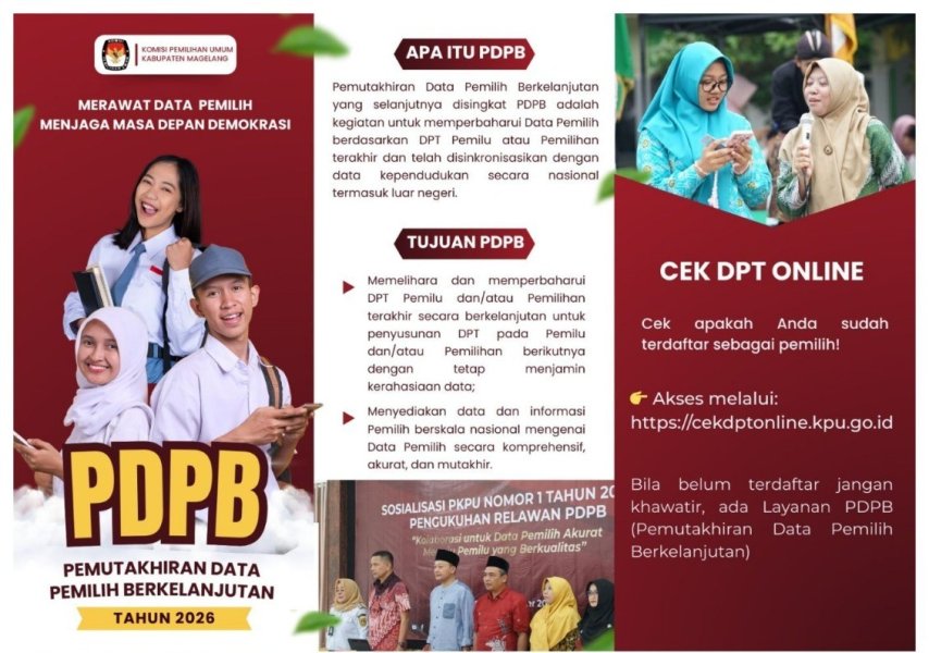 KOTA MUNGKID_KPU Kabupaten Magelang menerbitkan E-Brosur PDPB sebagai sarana sosialisasi secara masif melalui platform digital kepada masyarakat. tentang program Pemutakhiran Data Pemilih Berkelanjutan (PDPB) Tahun 2026. Brosur elektronik ini disebarluaskan melalui aplikasi pesan instan WhatsApp (WA) grup mantan badan adhoc Pemilu dan Pemilihan di Kabupaten Magelang. Teroboson penyebaran informasi ini diharapkan dapat menjangkau seluruh lapisan masyarakat yang sudah lekat dengan penggunaan platform komunikasi daring. Ketua KPU Kabupaten Magelang Ahmad Rofik, menyampaikan sosialisasi PDPB menggunakan E-Brosur merupakan langkah strategis untuk memperluas jangkauan penyebaran informasi hingga ke lapisan masyarakat paling bawah.“E-Brosur PDPB ini kami susun sebagai sarana edukasi yang sederhana dan mudah dipahami masyarakat. Harapannya, masyarakat mengetahui pentingnya Daftar Pemilih dalam pemilu dan pemilihan, sehingga muncul kesadaran untuk aktif mengecek data pemilih dan berpartisipasi melaporkan setiap perubahan data. Merawat data pemilih berarti menjaga masa depan demokrasi,” ujarnya. E-Brosur PDPB berisi informasi tentang cara mengecek status data pemilih dalam Daftar Pemilih Tetap (DPT) secara mandiri melalui laman Cek DPT Online KPU dan memuat penjelasan mengenai bagaimana cara masyarakat dapat berpartisipasi aktif dalam melaporkan perubahan data pemilih, seperti perubahan elemen data kependudukan, pindah domisili, perubahan status perkawinan, hingga laporan pemilih yang tidak lagi memenuhi syarat karena telah meninggal dunia atau megalami perubahan status dari sipil menjadi Polri atau TNI. Siti Nurhayati Ketua Divisi Perencanaan, Data, dan Informasi KPU Kabupaten Magelang, yang membawahi langsung program kerja PDPB menambahkan, pelaksanaan PDPB membutuhkan kolaborasi antara KPU dan masyarakat. “Data pemilih yang akurat tidak dapat terwujud tanpa keterlibatan aktif masyarakat. Melalui E-Brosur PDPB ini, KPU mengajak seluruh warga Kabupaten Magelang untuk peduli dengan program KPU menjaga Data Pemilih, sehingga pada akhirnya masyarakat secara sadar ikut menjaga validitas data pemilih dengan cara melaporkan setiap perubahan data kependudukan secara benar dan tepat waktu,” jelasnya.(***/RED)