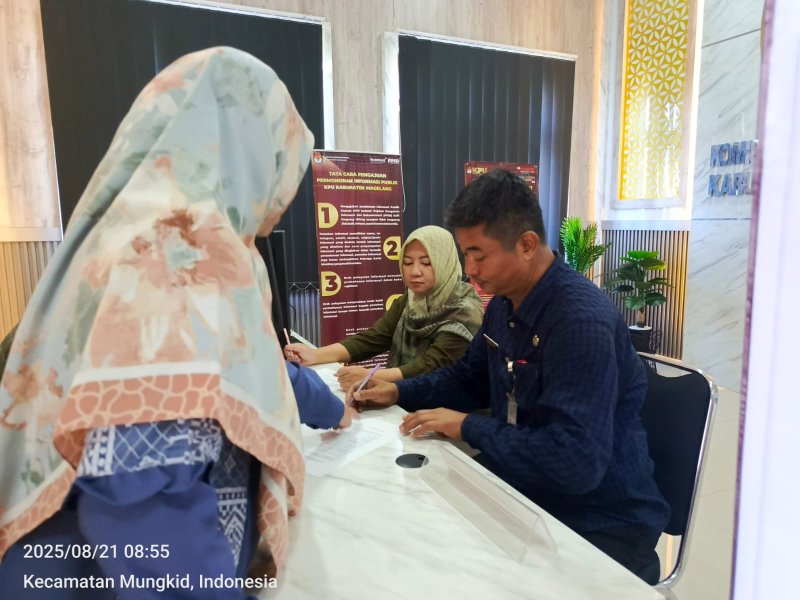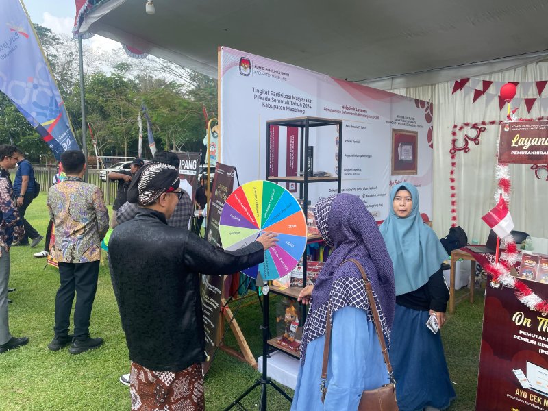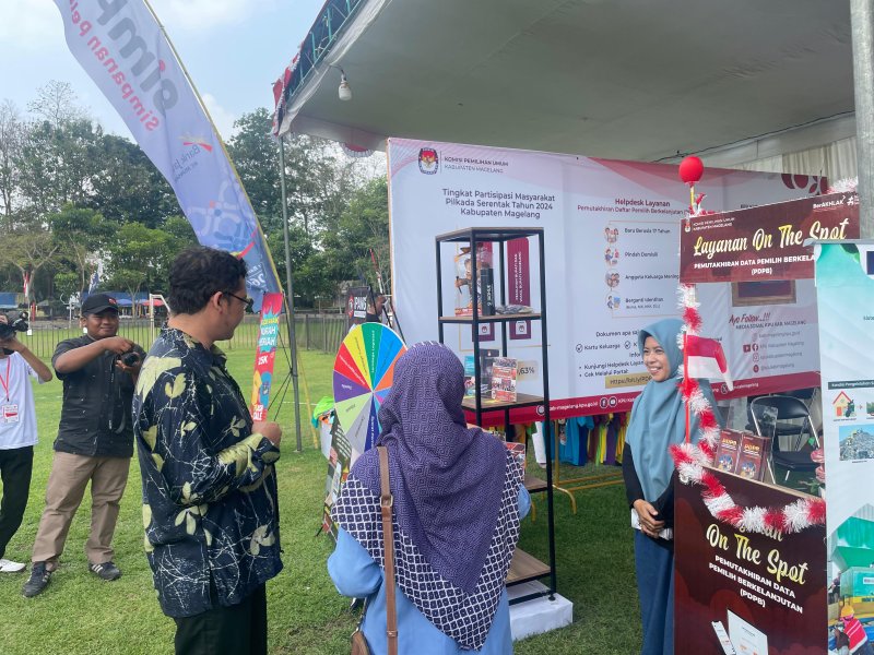 KOTA MUNGKID_ Layanan Pemutakhiran Data Pemilih Berkelanjutan (PDPB) On The Spot KPU Kabupaten Magelang hadir menyemarakkan Pameran Semarak Gemilang 2025 “Pasar Rakyat Magelangan” yang dibuka secara resmi Bupati Magelang Grengseng Pamuji, Jumat (22/8/2025), di Lapangan drh. Soepardi, Sawitan, Mungkid dalam rangkaian Perayaan Hari Ulang Tahun ke-80 Kemerdekaan RI Pemkab Magelang. Layanan PDPB ini menjadi satu rangkaian dalam Stand KPU Kabupaten Magelang yang juga memberikan edukasi langsung kepada pengunjung pameran berupa layanan cek DPT online, infografis pemilu dan pemilihan edukatif serta games interaktif rolet “Roda Demokrasi” yang mendapat antusias tinggi dari para pengunjung. Games rolet atau roda ini dimainkan dengan cara memutar roda yang berisi 12 kategori pertanyaan, mulai dari seputar PDPB, lembaga legislatif, eksekutif, yudikatif, demokrasi, hingga pengetahuan umum terkait kepemiluan. Bagi pengunjung beruntung yang dapat menjawab pertanyaan dengan benar sesuai berhentinya putaran rolet mendapatkan hadiah menarik dari KPU. “Melalui permainan ini, kami berharap pengunjung tidak hanya terhibur, tetapi juga bisa belajar tentang demokrasi dan kepemiluan dengan cara yang menyenangkan,” terang Eko Rahardjo, staf KPU yang bertugas menjaga stand pameran. Layanan cek DPT online juga menjadi daya tarik. Banyak pengunjung memanfaatkan kesempatan ini untuk memastikan apakah mereka sudah terdaftar sebagai pemilih atau belum. Menariknya, jurnalis yang meliput kegiatan Semarak Gemilang 2025 Pasar Rakyat Magelangan juga berkesempatan mencoba langsung layanan cek DPT online. Dalam stand pameran itu, KPU juga menyediakan brosur informasi PDPB yang dapat diperoleh pengunjung secara gratis. Brosur PDPB berisi tata cara melaporkan perubahan data pemilih, baik dengan datang langsung ke Kantor KPU Kabupaten Magelang maupun secara daring melalui link https://bit.ly/PDPB_KPUKABMAGELANG dan scan barcode yang sudah disediakan. Ketua Divisi Perencanaan Data dan Informasi KPU Kabupaten Magelang Siti Nurhayati, menyampaikan Layanan PDPB On The Spot dalam kegiatan pameran ini merupakan bentuk nyata komitmen KPU untuk hadir lebih dekat dengan masyarakat. “Melalui kegiatan Semarak Magelang Pasar Raya 2025 ini, kami ingin memberikan edukasi tentang pentingnya akurasi data pemilih sekaligus membuka ruang interaktif dengan masyarakat. Semakin banyak warga yang sadar dan aktif melakukan pengecekan data, maka kualitas Pemilu dan Pemilihan di masa depan akan semakin baik,” ujarnya. Ia menegaskan partisipasi masyarakat memegang peran penting dalam menyukseskan Pemutakhiran Data Pemilih Berkelanjutan (PDPB). Tanpa kesadaran dan keterlibatan aktif warga dalam melaporkan perubahan data, pemutakhiran data pemilih tidak akan optimal. “Kami berharap masyarakat semakin proaktif, sebab keberhasilan PDPB bukan hanya tanggung jawab KPU, melainkan juga partisipasi bersama seluruh warga,” tambahnya.(***/RED)