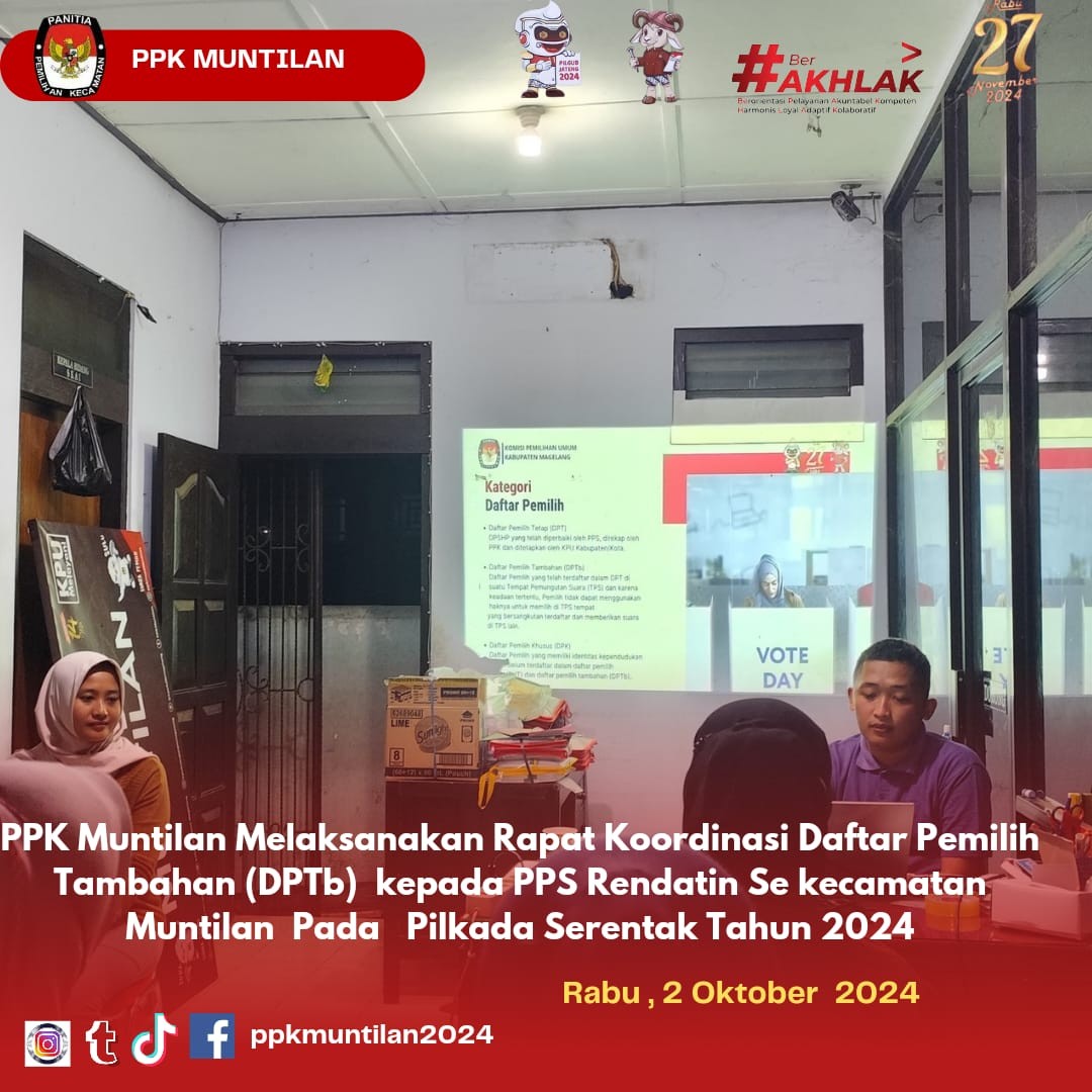 MUNTILAN_Daftar Pemilih Tetap (DPT) Pilkada 2024 Kecamatan Muntilan telah ditetapkan sejumlah 61.950, terdiri 30.624 laki-laki dan 31. 326 perempuan.Mereka tersebar di 114 Tempat Pemungutan Suara (TPS) di 14 desa.Ada penurunan jumlah DPT dari DPT saat Pemilu 2024,namun jumlahnya tidak banyak. Kini Panitia Pemilihan Kecamatan(PPK) juga tengah membuka layanan Pindah Memilih bagi pemilih yang sudah terdaftar pada DPT disuatu TPS, namun karena keadaan tertentu pemilih tidak dapat menggunakan hak pilihnya di TPS tempat yang bersangkutan terdaftar dan memaksa harus memberikan suara di TPS lain.Layanan ini akan dibuka hingga tanggal 28 Oktober untuk tahap pertama. “Bagi warga yang ingin mengajukan pindah memilih mulai sekarang sudah dapat menghubungi PPK atau PPS terdekat untuk memperoleh layanan itu”, ujar Azka, anggota PPK Muntilan yang membidangi tugas pemutakhiran data pemilih tingkat kecamatan. Pemilih yang berhak mengajukan pindah memilih antara lain dengan dengan kondisi atau alasan bertugas di Tempat Lain;pasien Rawat Inap dan pendamping; tertimpa bencana alam; menjadi tahanan Rutan atau Lapas; Disabilitas di Panti Sosial/Rehabilitasi; sedang menjalani rehabilitasi narkoba;dan atau sedang bekerja diluar domisili;serta sedang menjalani tugas belajar; dan pindah domisili. ( Andy Gris/anggota PPK Muntilan)