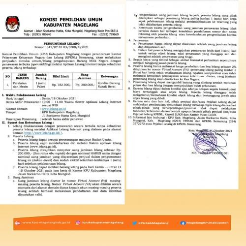 Pengumuman Lelang Penghapusan BMN Tahun 2021 Sabtu, 01 Januari 2022 20:22 454 Kota Mungkid_ KPU Kabupaten Magelang mengumumkan kepada masyarakat perihal Lelang Penghapusan BMN Tahun 2021 Baca Selengkapnya