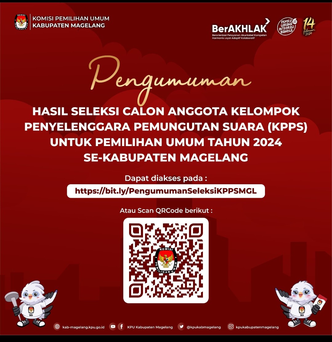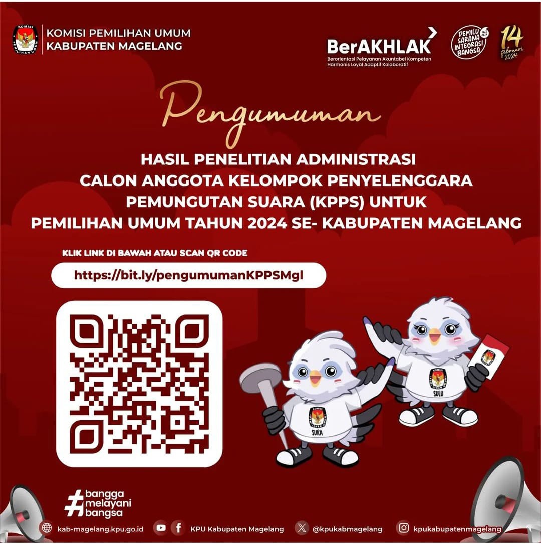Kota Mungkid_ KPU Kabupaten Magelang mengumumkan Hasil Seleksi Anggota Kelompok Penyelenggara Pemilu (KPPS) pada Pemilu Tahun 2024 Tingkat Kabupaten Magelang. Pengumuman selengkapnya Klik Disini
