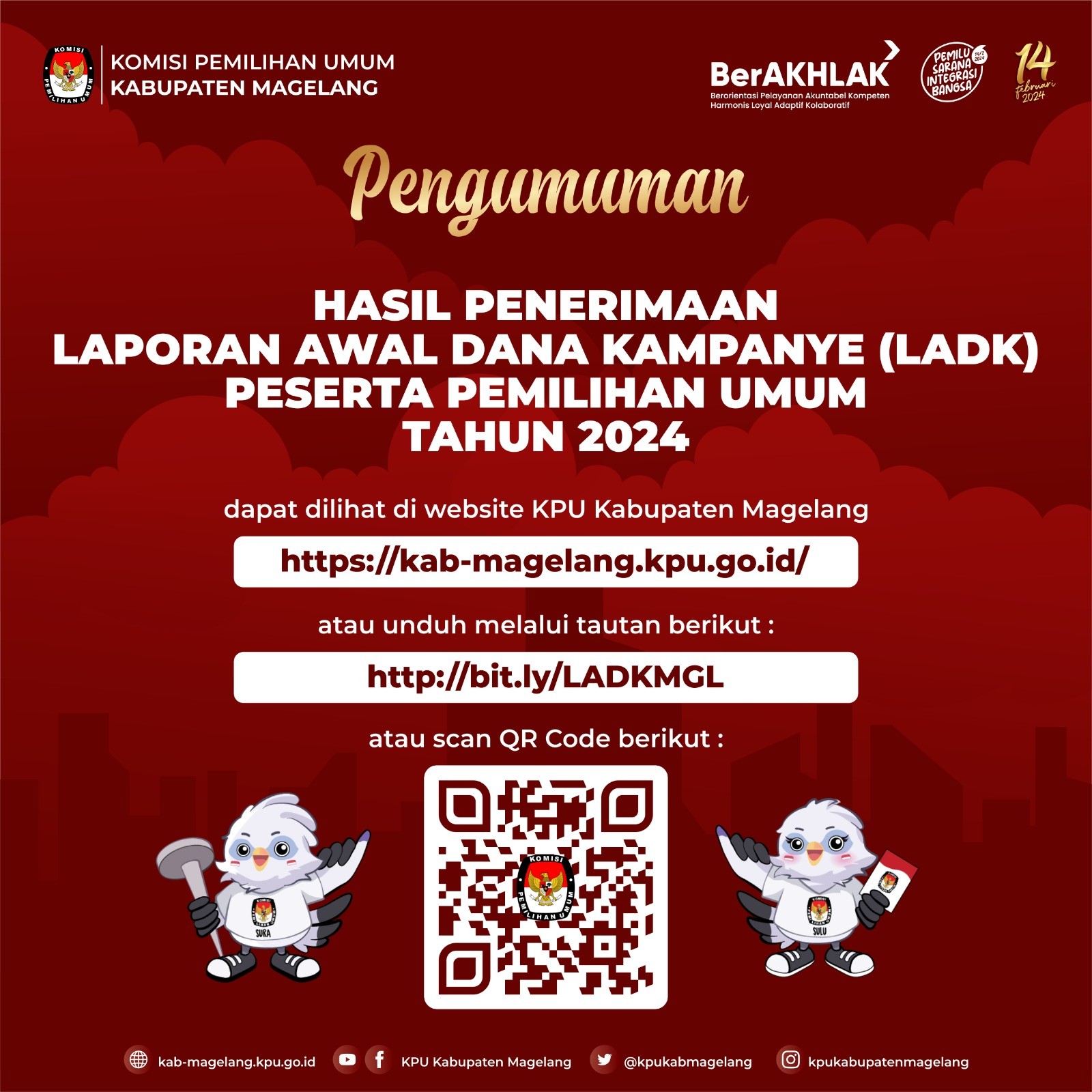 Kota Mungkid- KPU Kabupaten Magelang mengumumkan Penerimaan Laporan Awal Dana Kampanye (LADK) Peserta Pemilu 2024 Tingkat Kabupaten Magelang. Selengkapnya Klik disini