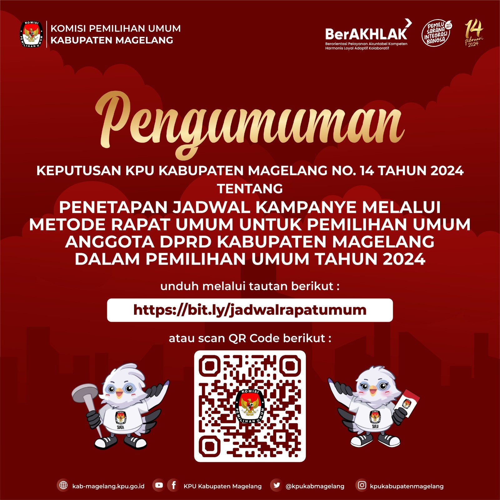 Kota Mungkid_ KPU Kabupaten Magelang mengumumkan Keputusan KPU Kabupaten Magelang tentang Jadwal Kampanye melalui Metode Rapat Umum untuk Pemilu Anggota DPRD Kabupaten Magelang dalam Pemilu 2024. Pengumuman Selengkapnya Klik disini