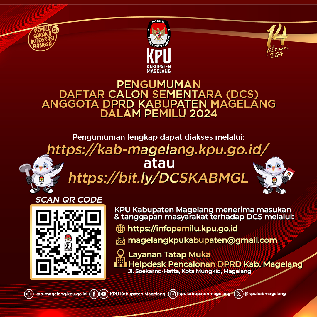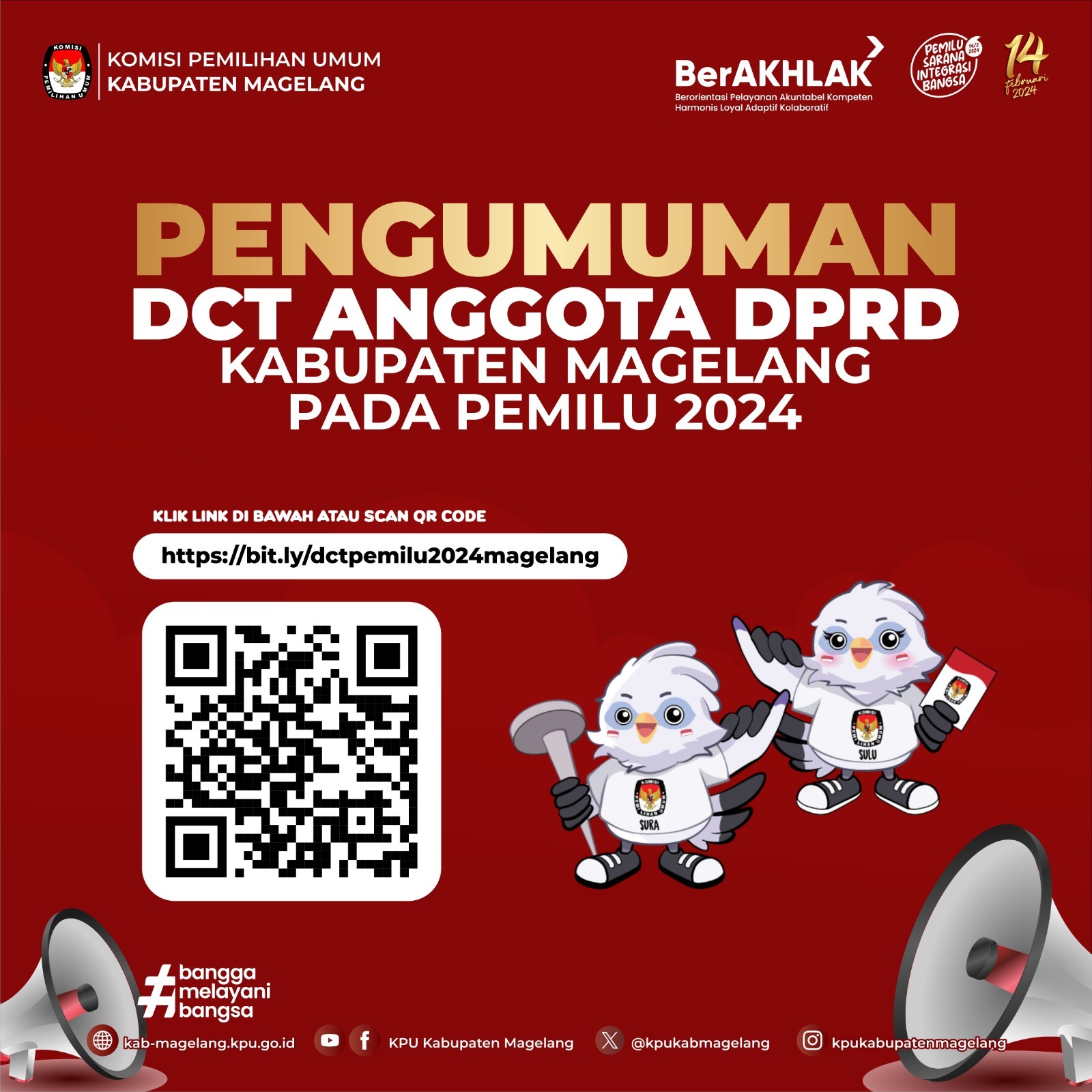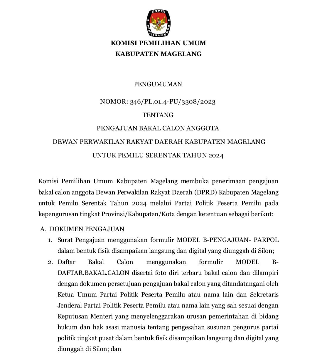 Kota Mungkid_ Bahwa untuk melaksanakan ketentuan Pasal 85 ayat (1) Peraturan Komisi Pemilihan Umum Nomor 10 Tahun 2023 tentang Pencalonan Anggota Dewan Perwakilan Rakyat, Dewan Perwakilan Rakyat Daerah Provinsi, dan Dewan Perwakilan Rakyat Daerah Kabupaten/Kota dan berdasarkan Keputusan Komisi Pemilihan Umum Kabupaten Magelang Nomor 123 Tahun 2023 tentang Daftar Calon Tetap Anggota Dewan Perwakilan Rakyat Daerah Kabupaten Magelang Dalam Pemilihan Umum Tahun 2024 tanggal 3 November 2023, Komisi Pemilihan Umum Kabupaten Magelang mengumumkan Daftar Calon Tetap (DCT) Anggota Dewan Perwakilan Rakyat Daerah Kabupaten Magelang dan persentase keterwakilan perempuan dalam DCT. Klik Pengumuman DCT Selengkapnya- (***RED) .