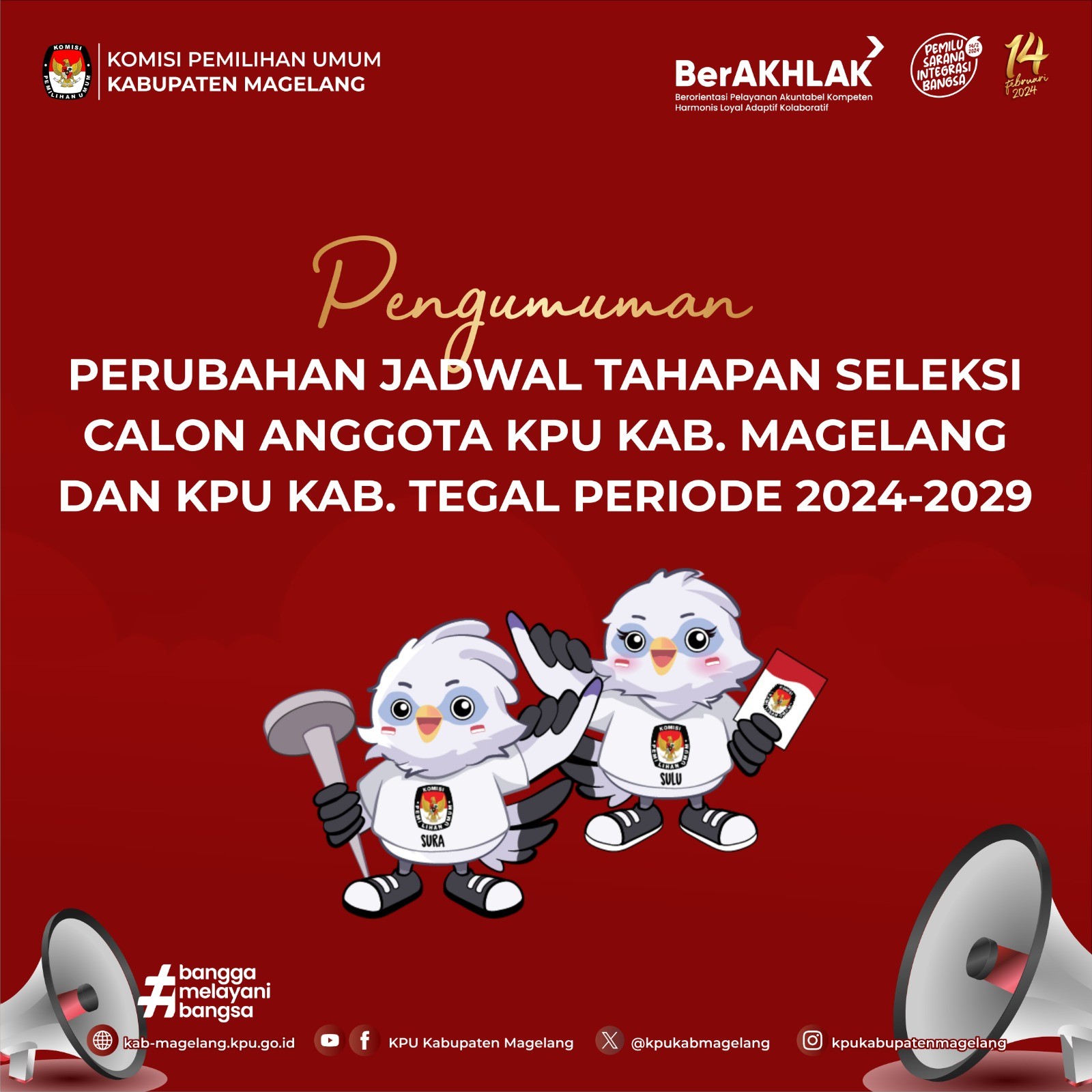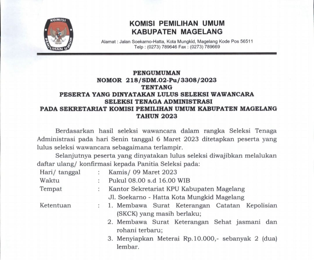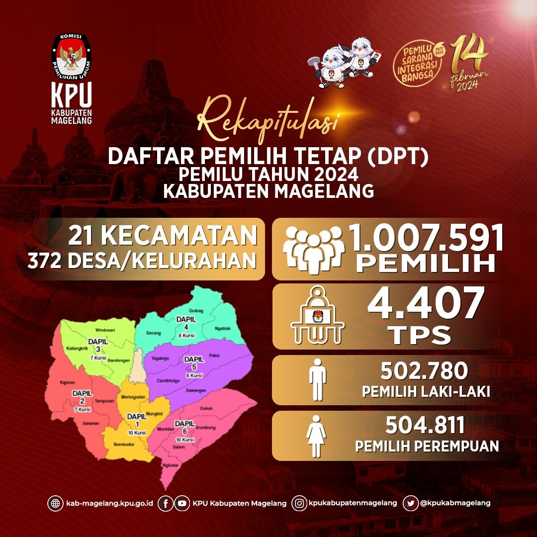 Kota Mungkid_ Bahwa untuk melaksanakan ketentuan Pasal 85 ayat (1) Peraturan Komisi Pemilihan Umum Nomor 10 Tahun 2023 tentang Pencalonan Anggota Dewan Perwakilan Rakyat, Dewan Perwakilan Rakyat Daerah Provinsi, dan Dewan Perwakilan Rakyat Daerah Kabupaten/Kota dan berdasarkan Keputusan Komisi Pemilihan Umum Kabupaten Magelang Nomor 123 Tahun 2023 tentang Daftar Calon Tetap Anggota Dewan Perwakilan Rakyat Daerah Kabupaten Magelang Dalam Pemilihan Umum Tahun 2024 tanggal 3 November 2023, Komisi Pemilihan Umum Kabupaten Magelang mengumumkan Daftar Calon Tetap (DCT) Anggota Dewan Perwakilan Rakyat Daerah Kabupaten Magelang dan persentase keterwakilan perempuan dalam DCT. Klik Pengumuman DCT Selengkapnya- (***RED) .